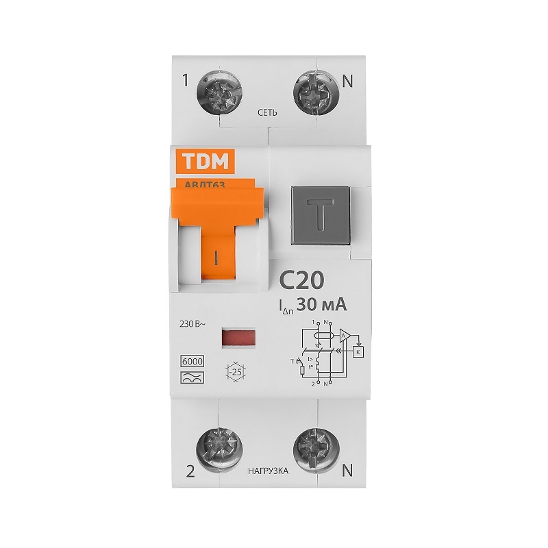 Автомат дифференциальный TDM АВДТ 63 6кА, С 20А, 30мА, тип А, 1P+N