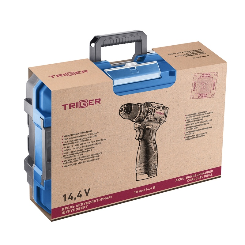 Дрель-шуруповерт Trigger 20130, бесщеточная, 14,4V, 10 мм, 48 Нм, 2 аккумулятора Li-ion (2Ач), кейс в Барнауле