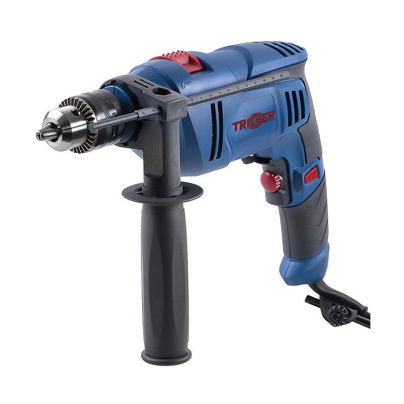 Дрель ударная сетевая Trigger 20012 — мощная дрель с ударной способностью легкого перфоратора. Предназначена для работ с деревом, металлом, пластиком, керамикой, кирпичом, камнем и бетоном. Режим удара применяется при сверлении бетона и кирпича, особенно удобен при работе с риском скалывания материала: углах, рядом с кромкой.