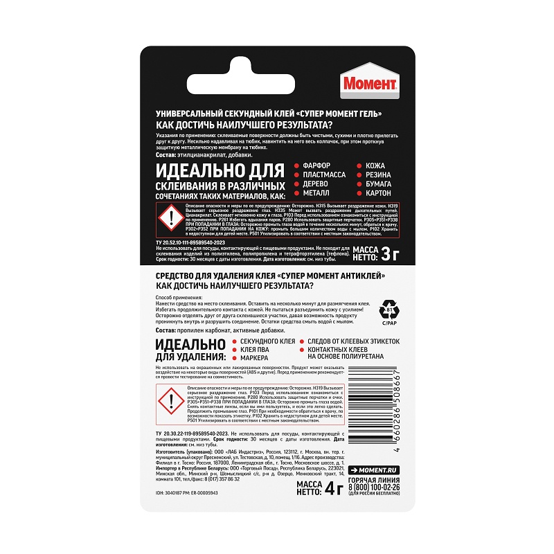 - Супер Момент Антиклей (4 г) подходит для легкого и быстрого очищения поверхностей от большинства видов клея, а также освобождения склеившихся пальцев.