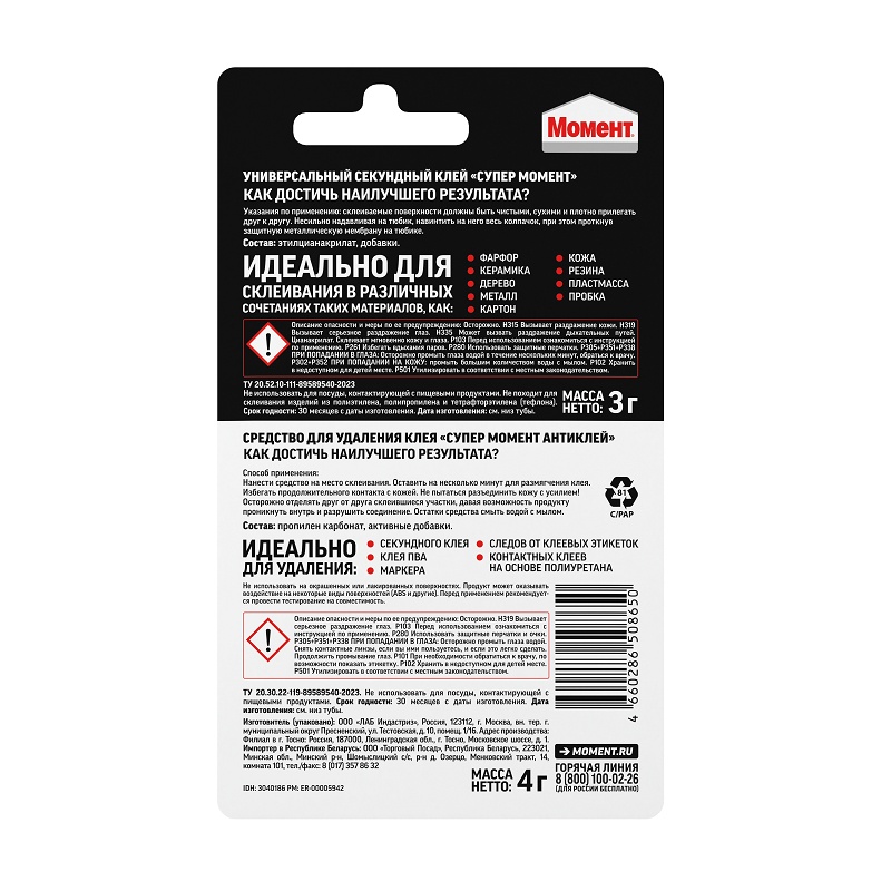 • Супер Момент Антиклей (4 г) подходит для легкого и быстрого очищения поверхностей от большинства видов клея, а также освобождения склеившихся пальцев.