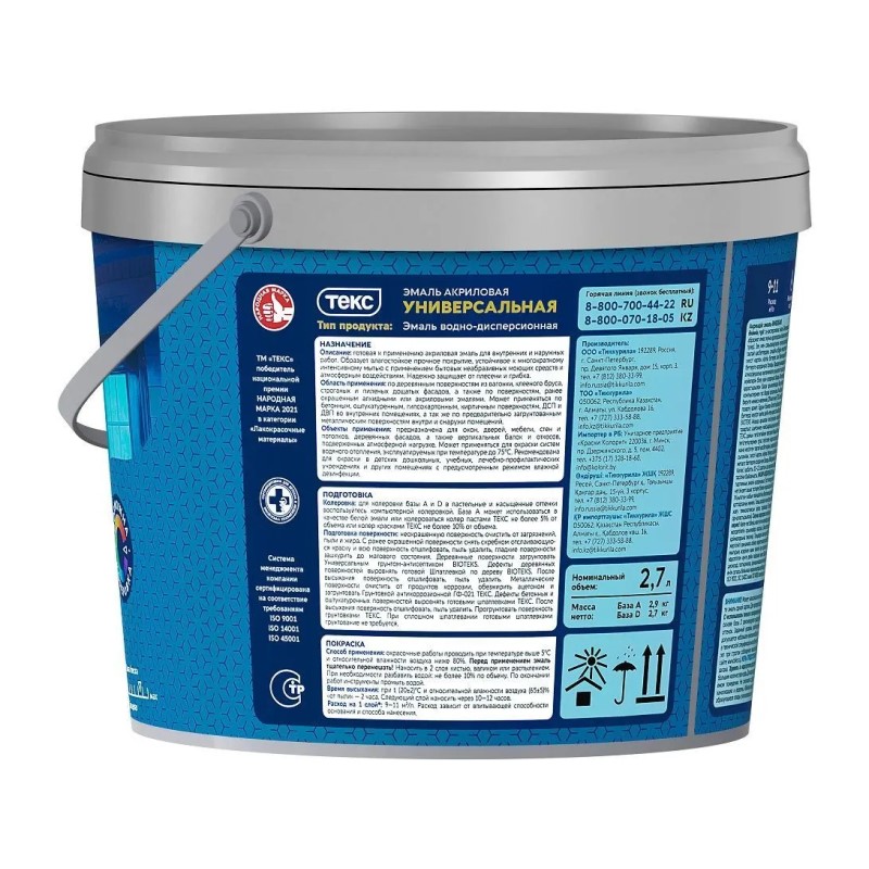 В строительном магазине Сатурн можно купить товар "Эмаль универсальная Текс акриловая белая матовая (2,7 л)" по цене от 2318 руб с доставкой за 2 часа по Барнаулу или оформить самовывоз.