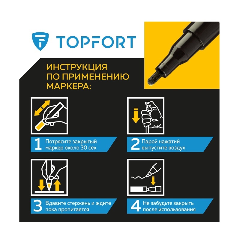 Предостережения: плотно закрывайте колпачок после применения, держать маркер вдали от источников тепла и воспламенения.