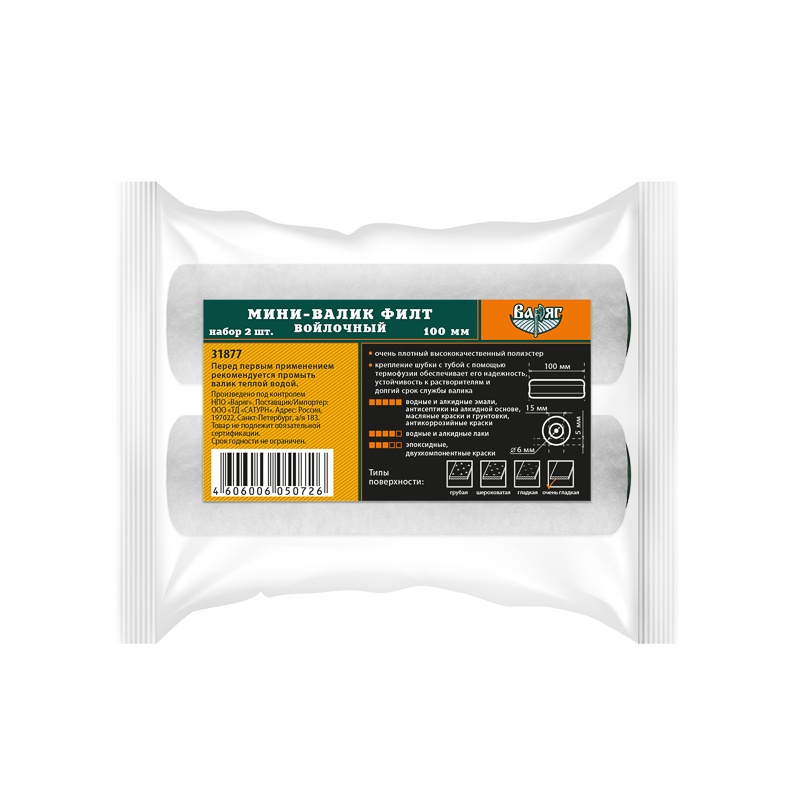 В строительном магазине Сатурн можно купить товар "Мини-валик Варяг 31877 войлочный, ворс 5 мм, 100 мм (уп. 2 шт.)" по цене от 136 руб с доставкой за 2 часа по Барнаулу или оформить самовывоз.