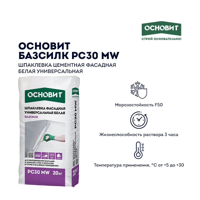 Шпаклевка цементная фасадная Основит Базсилк PC30 MW белая, 20 кг