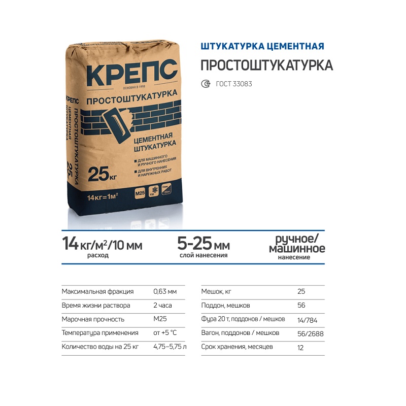 Штукатурка Крепс Простоштукатурка для внутр. и наруж. работ, 25 кг