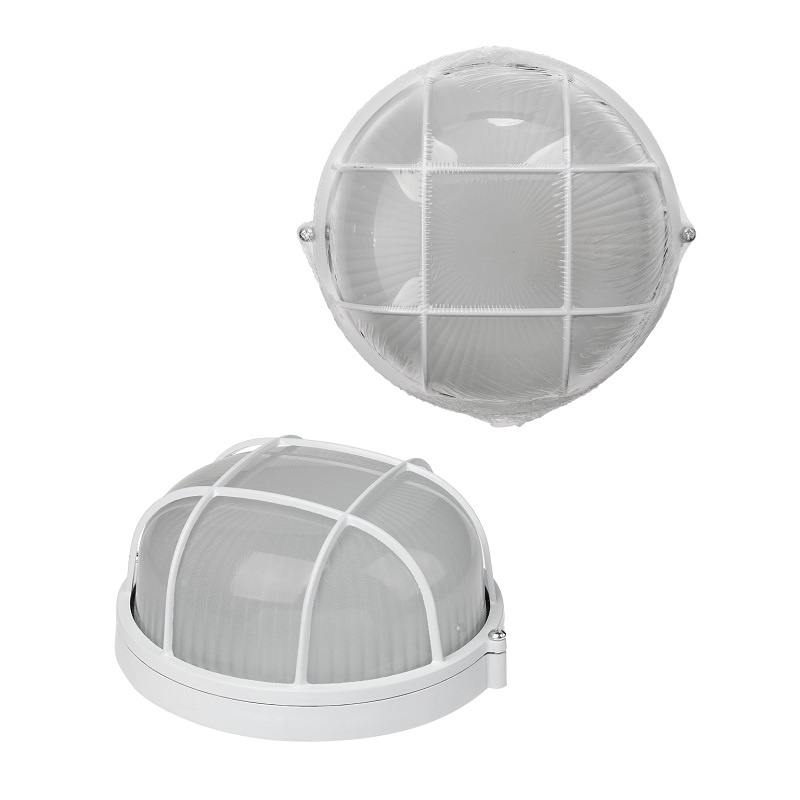 Светильник НПБ под Е27, 60 Вт, круг с решеткой, белый металл+стекло, IP54