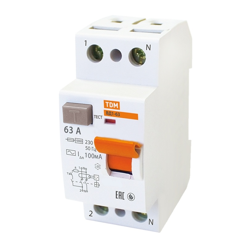 Устройство защитного отключения TDM ВД1-63 63А, 100мА, тип АС, 2П