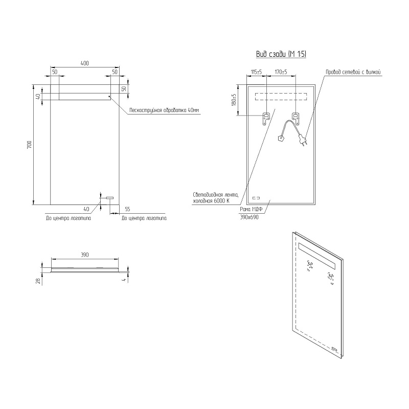 Комплектация: Зеркало с подсветкой, комплект креплений, инструкция, гарантийный талон.